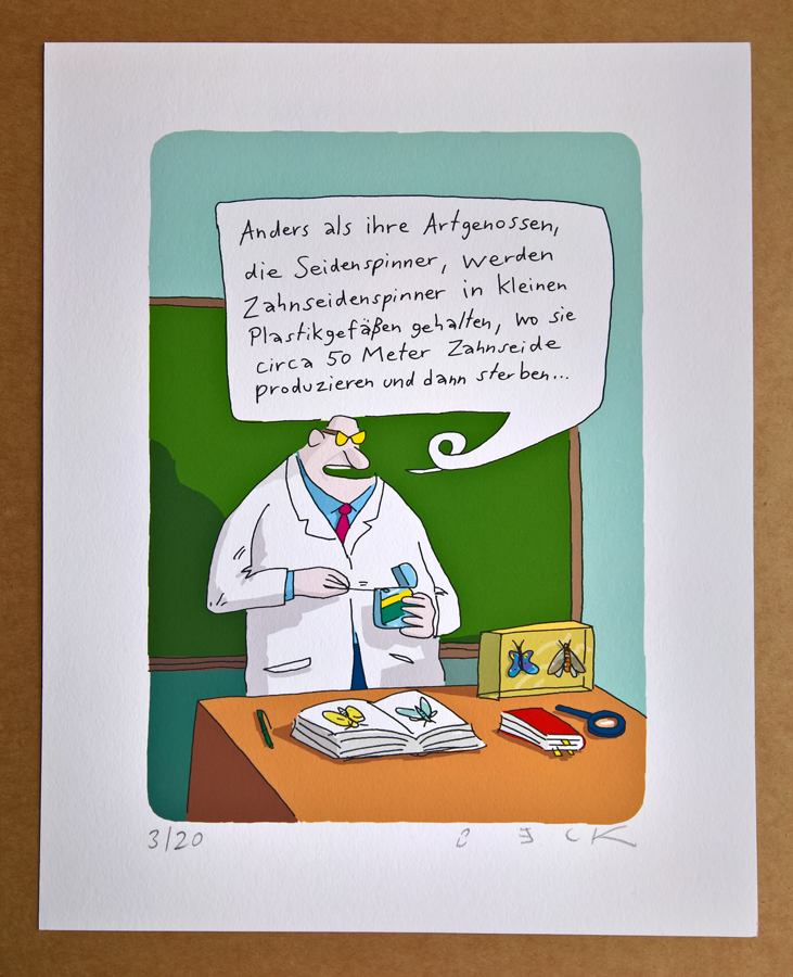 so ein lichtechter druck auf künstlerpapier der firma hahnemühle hält, laut hersteller, mindestens 70 jahre, benötigt keinen speziellen bilderrahmen, der das blatt vor ausbleichen durch sonnenlicht schützt, muss nur in einen standard-rahmen gelegt werden und ist, egal wie gerahmt, immer eine zierde an der wand. gönnen sie sich, oder ihren lieben, mal eine kleine dosis humor in form von großer cartoon-kunst.