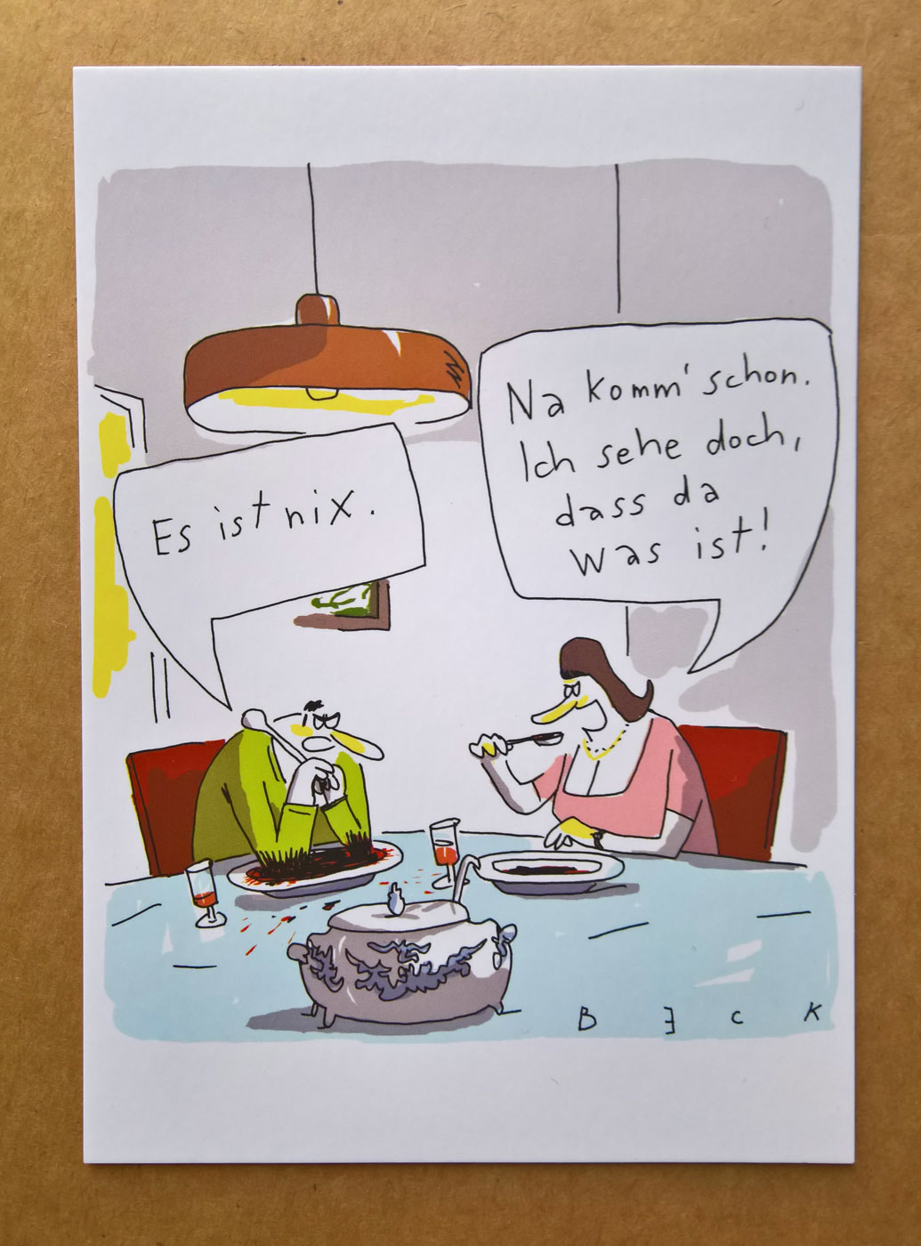 aus der schneeschnee-postkartenserie, a6 groß, also klassische postkarte, gedruckt auf festem 350gr postkartenkarton mit matter lackierung als uv-schutz, die rückseite ist schlicht und beschreibbar. (die zeichnung war original eine illustration in der brigitte, ha!)