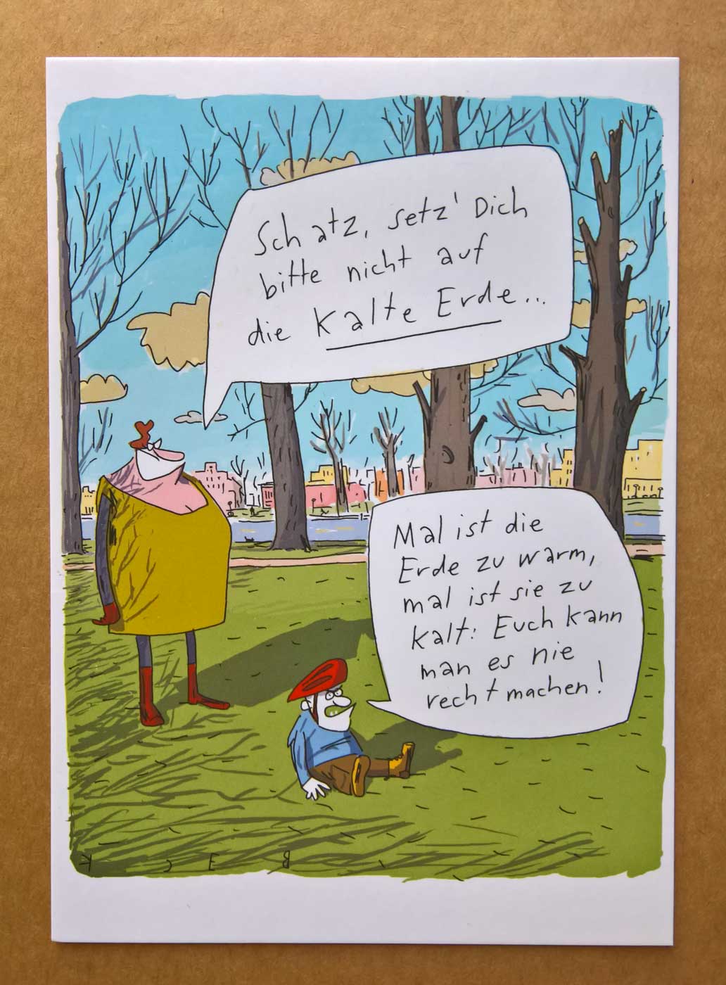aus der schneeschnee-postkartenserie, a6 groß, also klassische postkarte, gedruckt auf festem 350gr postkartenkarton mit matter lackierung als uv-schutz, die rückseite ist schlicht und beschreibbar.